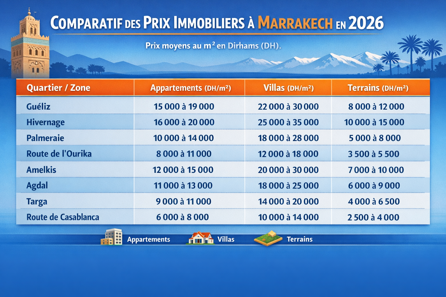 Découvrez les prix de l'immobilier à Marrakech en 2026, l'évolution des tarifs au m² par quartier et les tendances du marché immobilier marocain.